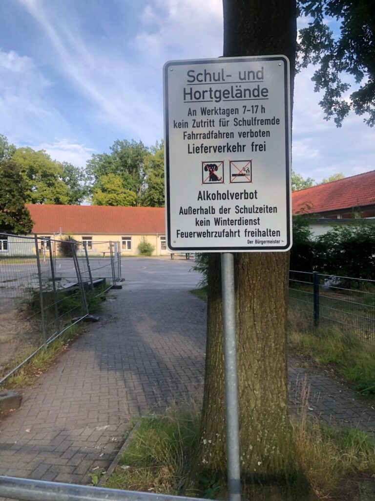 Seit 11.07.2024 ist das Betreten des Schulhofes an Werktagen (also auch samstags) in der Zeit von 07:00 Uhr bis 17:00 Uhr für „Schulfremde“ verboten. Dieses Schild ließ die Stadtverwaltung an der Moordorfer Straße sowie an der Heinrich-Brandes-Straße aufstellen. Nähere Hintergründe sind leider nicht bekannt. Diese Regelung bedeutet weitere Wege für Eltern, die ihre Kinder in die KITA bringen oder auch vom Hort abholen wollen, da sie quasi nur über die Lausitzer Straße bzw. über die Heinrich-Brandes-Straße ihre Kinder bringen bzw. abholen dürfen. Ob das Verbot durch die Verwaltung oder die Schule/Hort kontrolliert wird, ist leider nicht bekant. (hen)